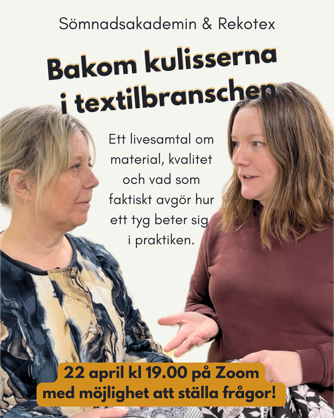 I det här livesamtalet pratar Matilda Olsson från Sömnadsakademin och Marie Jonsson från Rekotex om hur man kan förstå och bedöma tygkvalitet, vad som händer bakom kulisserna i textilbranschen och hur du kan göra mer medvetna val när du syr.